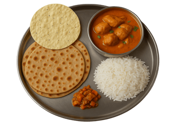 Chicken and rice served with 4 tawa rotis, papadum, mix pickle