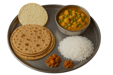 Rice, veg curry, 4 rotis, mix pickle, Papadum